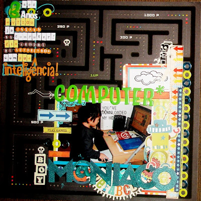 Nesse layout coloquei título em cima, muitos retalhos de papel, figuras recortadas e bordas de chipboard.