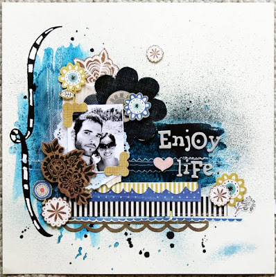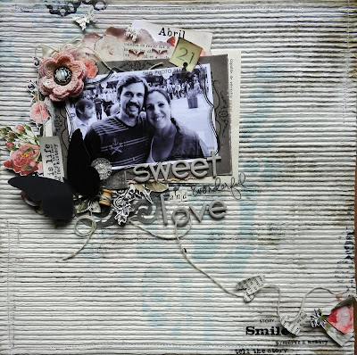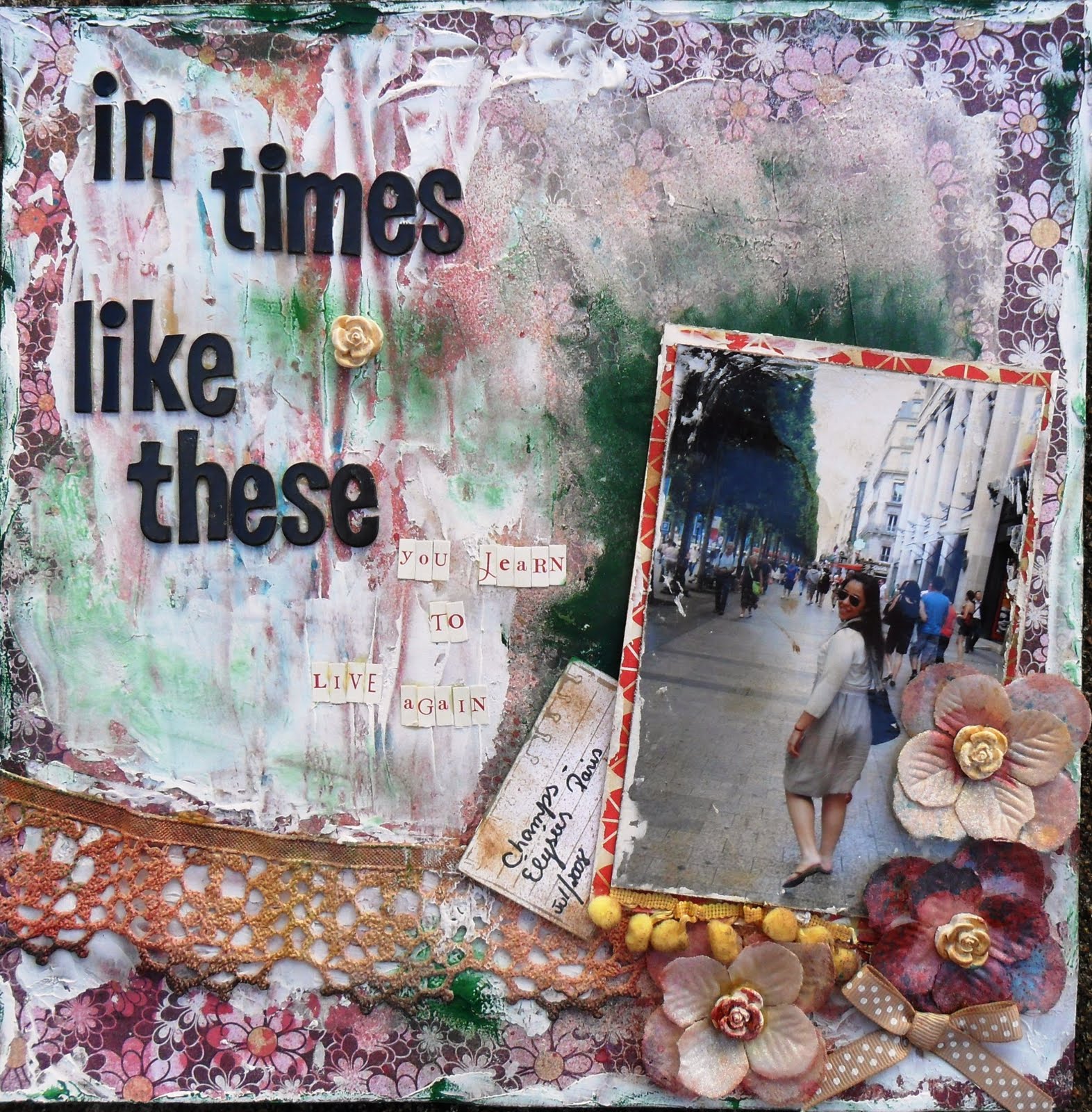 Olha que LO mais artístico, é da Irene Tan! A foto foi convertida em pb, carimbada, costurada, pintada, e vários elementos colados em cima do projeto! Shoowwww.
