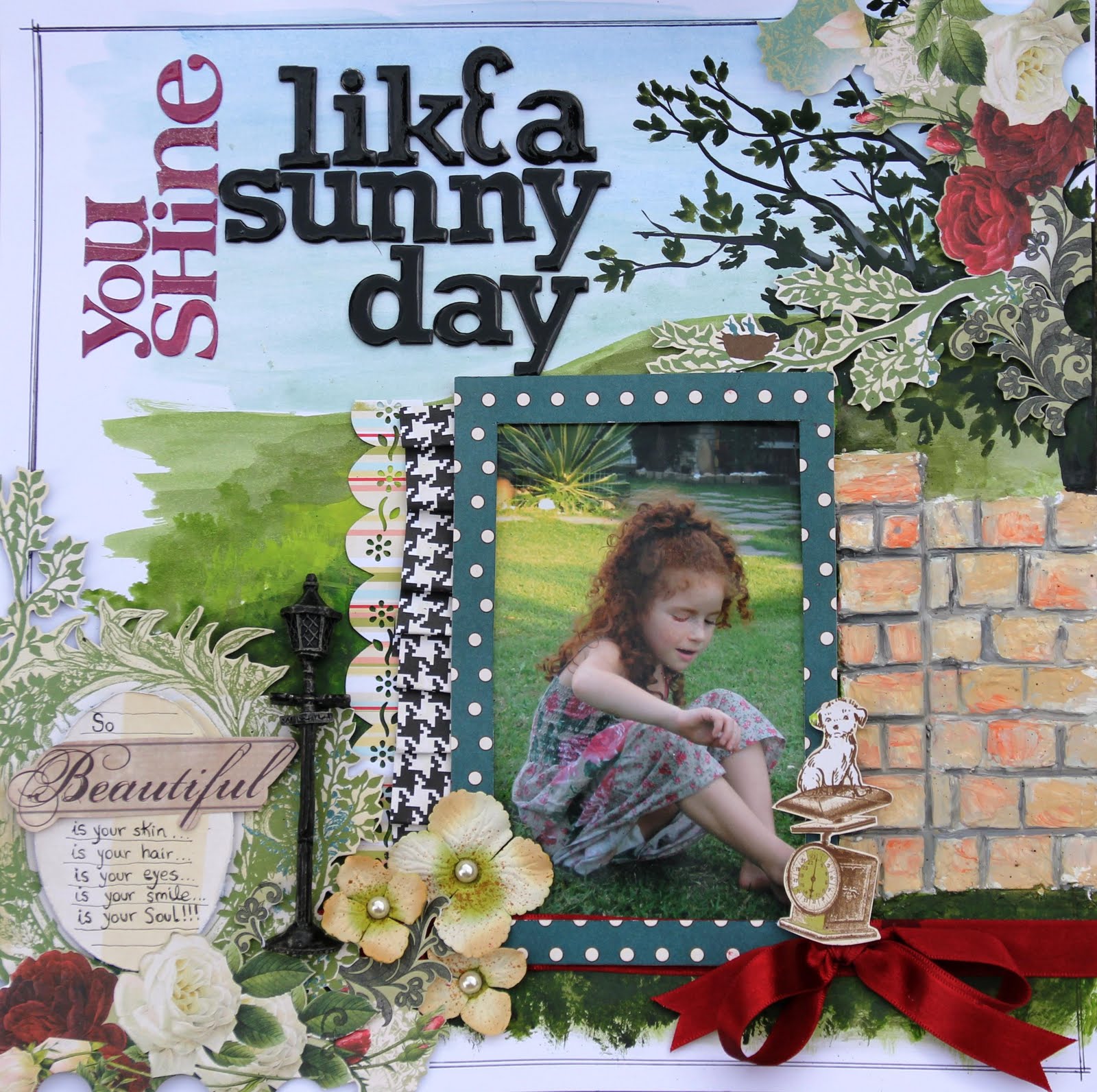Imprimi a foto bem grandona numa transparência para dar destaque mas tb aparecer o papel desbotado embaixo e dar contraste com os embellies coloridos.