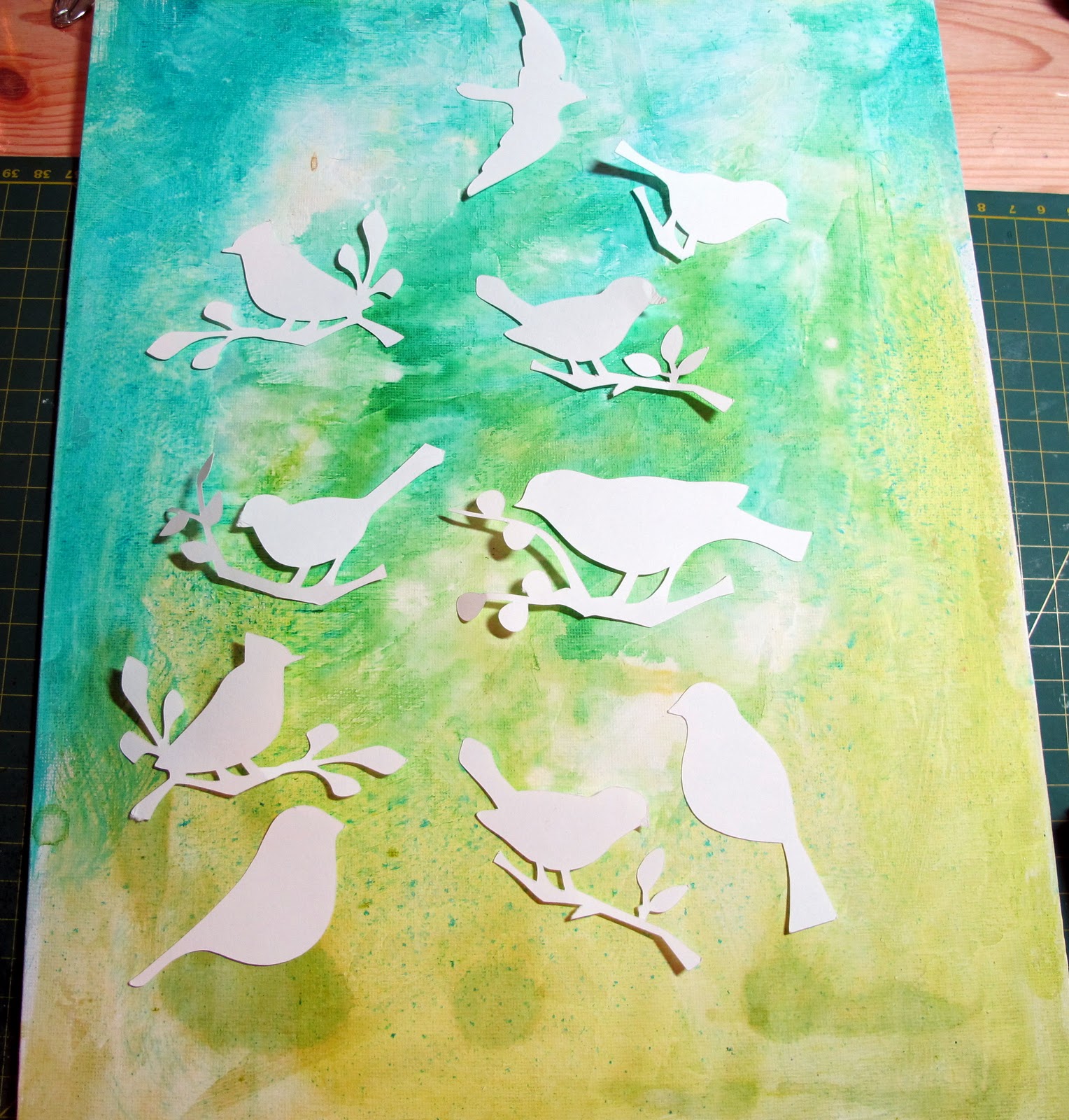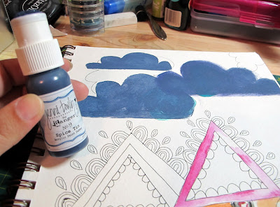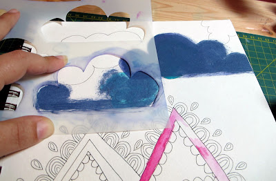 Eu quando fiz o video, usei esse desenho para mostrar alguns materiais, entao estava meio estranho. Com isso peguei um stencil de Nuvens e passei tinta por cima... Porque eu ja nao estava gostando do jeito que eu tinha feito as nuvens...