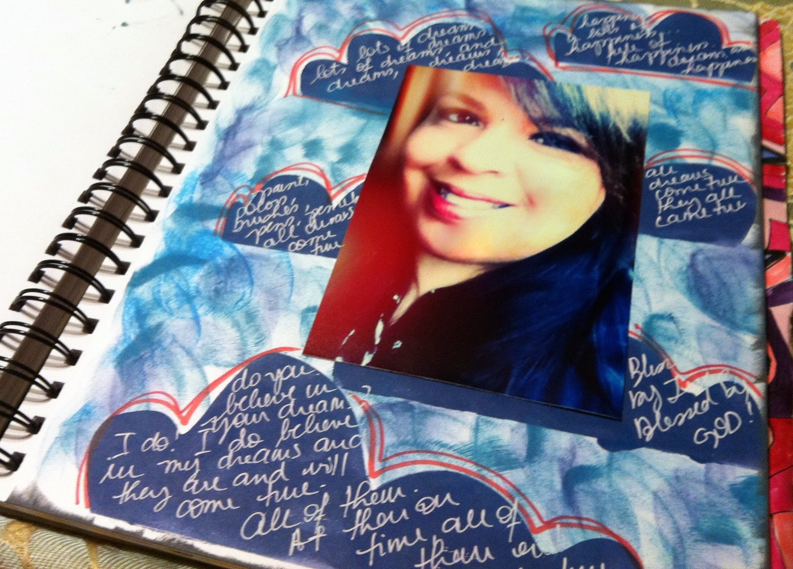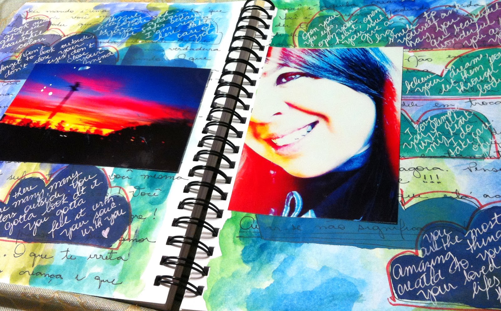 No fim ficou assim.... pintei com um pouco de tudo e depois escrevi umas coisinhas por cima. Esta pagina e mais para mostrar os materiais e como a gente pode explorar de tudo um pouco. Com produtos mais sofisticados e com outros nem tanto...