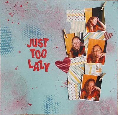 Comecei o LO pela colagem de vários diecuts, alfabetos soltos e retalhos de papel, inclusive que tinham alguns recortes. Passei tinta spray com estêncial da Christy Tomlinson e depois passei camadas de gesso branco em cima desse mesmo estêncil, que se misturou com pinguinhos de tinta spray que eu tinha colocado. Tb. carimbei o background.
