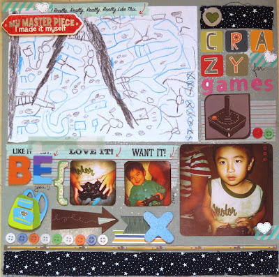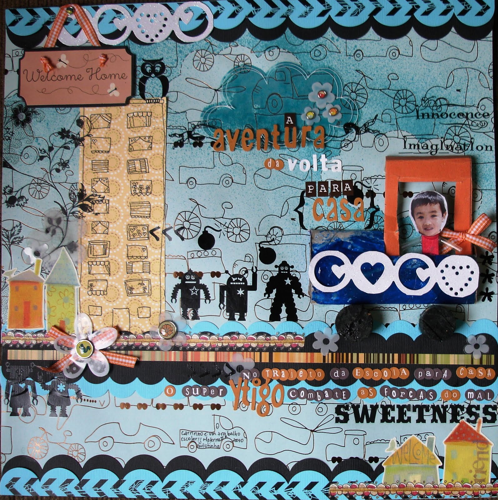 Inclui o desenho de um cenário de videogame feito pelo meu filho com fotinhas deles brincando...