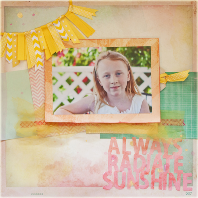 Vejamos o que a Margie Visnick fez: "o primeiro item que escolhi foi a bandeirola amarela porque pensei em como seria simples fazê-la com fitas e washi tape. Depois escolhi as tintas aquarela, e pensei sobre minhas tintas e sprays pegando pó na estante, e depois na maravilhosa folha de papel de scrap de cor laranja e ombré da linha da Amy Tangerine’s Yes, Please. Esse pensamento me levou a selecionar fotos de ombré laranja, pink e coral. Eu vi algumas fotos de aquarelas coloridas e flores que combinavam com o sentimento que eu queria passar para a minha página (calorosa, bonita e feminina)".