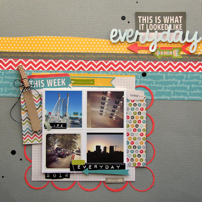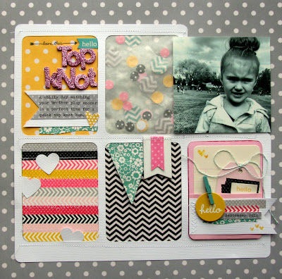 Layout totalmente artsy com ponto focal em dois journaling cards com design bastante simples, até geométrico. O fundo pintado, os embellies coloridos e o título lembrando grafite deram o ar divertido que em nada lembraram o uso tradicional deles, não é mesmo?