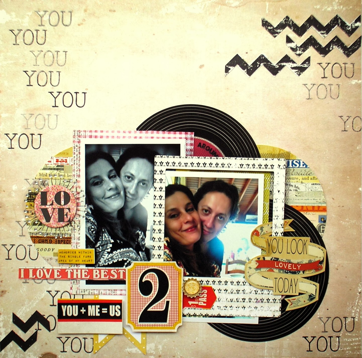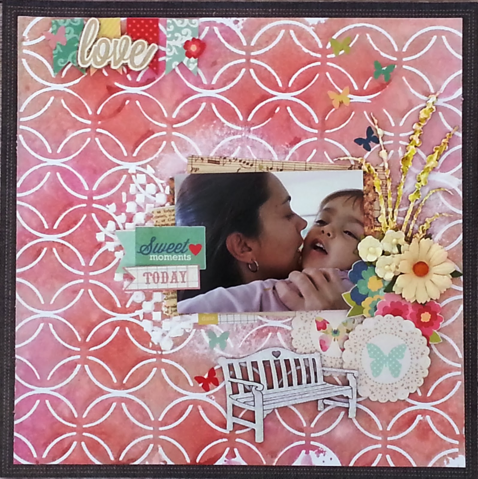 Note que o stencil foi colorido também. Mas o mais interessante dessa página da Dani é a harmonia entre todos os elementos. Podemos conseguir essa harmonia dispondo inicialmente foto, tapetinhos, embellishments como gostaríamos que ficassem, sem colar nada. Dessa forma podemos ter uma ótima noção onde ficará bom adicionar textura a página com o stenci/máscara. Legal para harmonizar os olhos é sempre criar focos para a foto.
